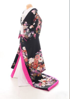 黒を基調とした中にもピンクと花柄が入った綺麗な着物です。