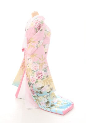 女の子らしさを表すようなピンクが綺麗な1着です。裾に向けて青へかかるグラデーションが素敵です。