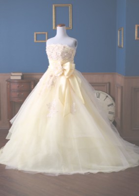 薄い黄色の綺麗なドレス。腰にある大きなリボンが目立ちます。
